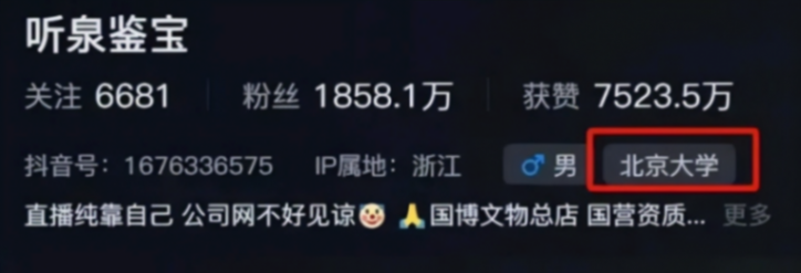 此前,“聽泉鑒寶”的賬號顯示“北京大學”標簽。有部分網友對他的北大學歷提出質疑,“聽泉鑒寶”此前在直播間也被問到“是北京大學還是北方大學”,他簡短回復到:“這個東西不重要”。