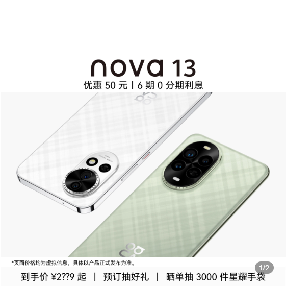 目前,華為官方商城已經開啟了華為nova 13和華為nova 13 Pro的預約,預約將在10月22日 20:29結束。官網的宣傳頁面顯示,華為nova 13的起售價格為2??9元,而華為nova 13 Pro的起售價格為3??9元。雖然售價并未完全公布,但已能確定華為nova 13的起售價格將低于3000元。