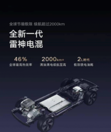 先解釋一下剛才說到的那些數(shù)據(jù)!根據(jù)車身上的涂裝文字顯示,這一代雷神電混系統(tǒng)擁有超過46%的發(fā)動機(jī)熱效率,虧電油耗達(dá)到了驚人的2L/100km,而且滿油滿電狀態(tài)下續(xù)航能力有望超過2200km。這意味著同樣的油量,它可以跑得更遠(yuǎn),效率更高。對于消費者來說,這意味著更長的續(xù)航里程和更低的燃油成本。而且這個2L/100km的油耗確實很香。