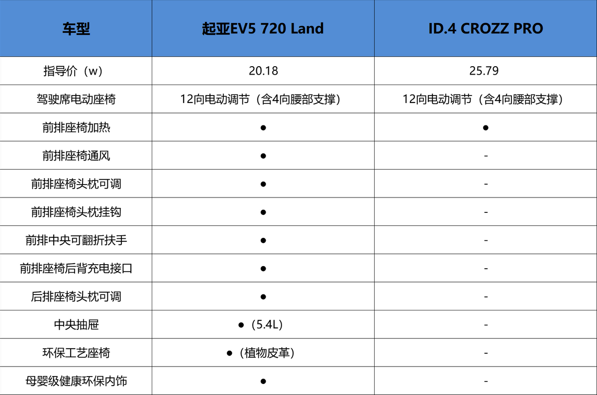 諸如座椅通風、頭枕可調、母嬰級健康環保內飾等配置,ID.4 CROZZ也都不具備,在保證車內的舒適、健康方面,是要遜色于起亞EV5。
