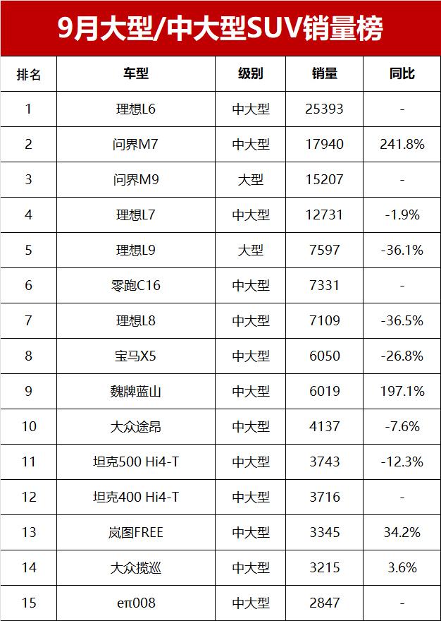 】為滿足國人對汽車消費升級的需求,如今越來越多的大型、中大型SUV推出市場,銷量也水漲船高。小編綜合乘聯會銷量數據顯示,2024年9月國內大型/中大型SUV市場零售銷量達到16.3萬輛,同比大幅增長59.2%。從9月份各車型銷量來看,新能源車成為大型、中大型SUV市場的銷售主力,銷量超過7千輛的七款車型全部屬于新能源車,其中理想汽車和問界汽車合資貢獻了六款車型,領先優勢明顯。