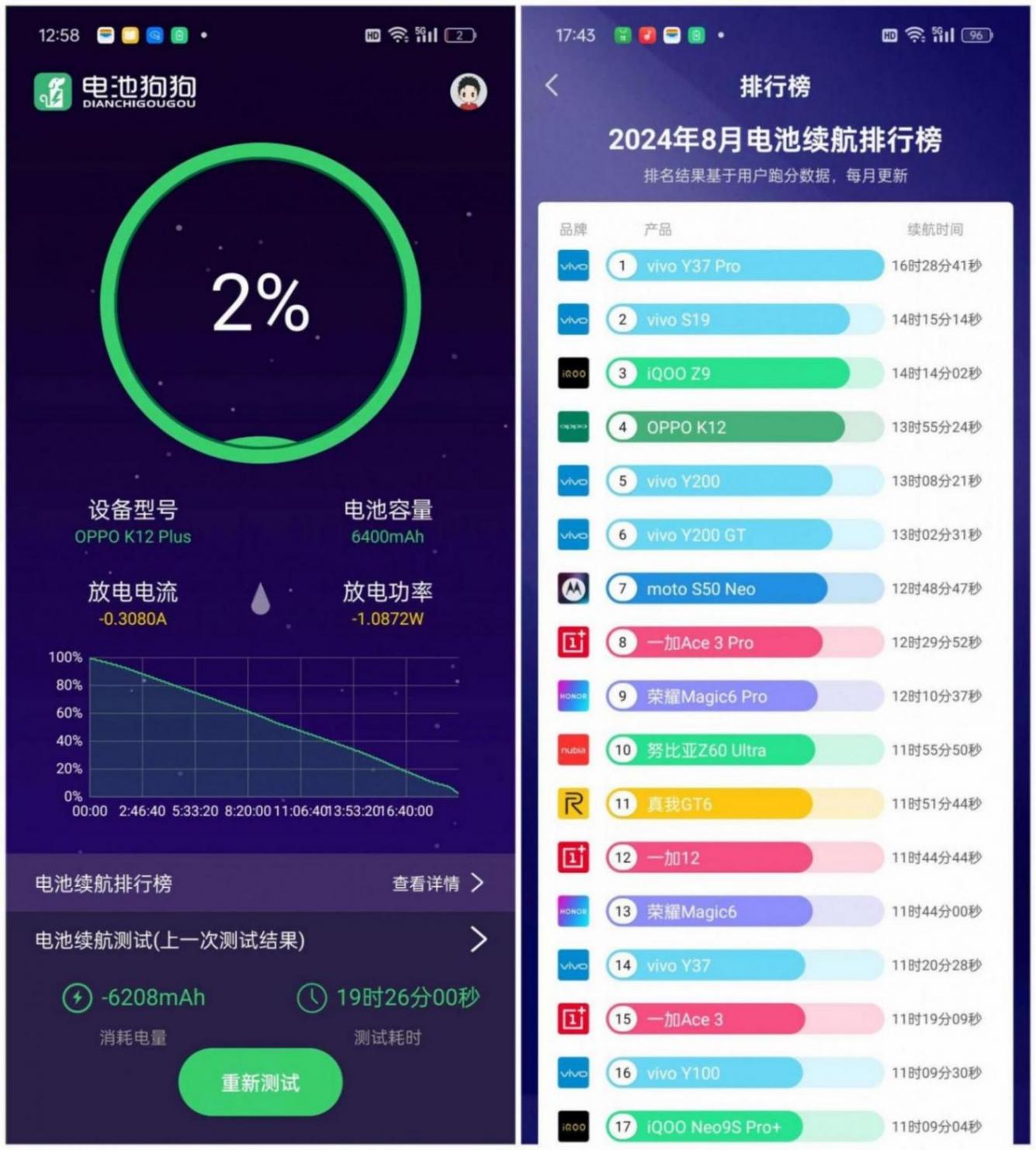 而如果我們再對照一下“電池狗狗”2024年8月電池續航排行榜的結果,可以發現,OPPO K12 Plus的排名要遠超目前榜上的第一名vivo Y37 Pro近三個小時,這樣的成績,短時間內能否有哪款機型能追上,恐怕確實得打一個大大的問號。