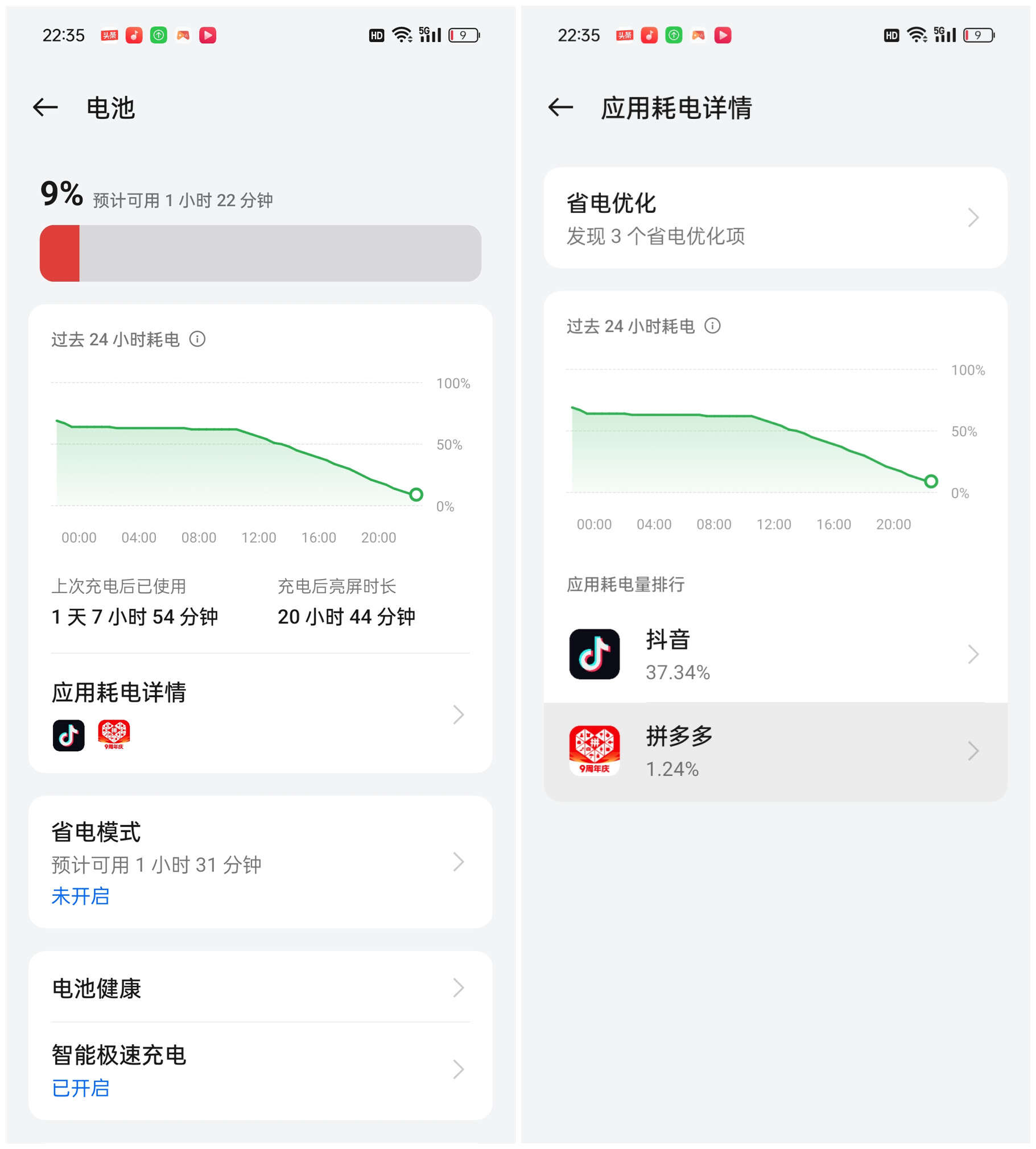 而如果將這款手機放在真實的使用場景下,我測試了一下,從滿電到9%,續航時間為1天7小時54分,其中亮屏時間20小時44分,持續刷抖音時間為12小時42分,而如果是玩《王者榮耀》可以續航11.2小時左右,即便只剩下最后的1%電量,依然能堅持微信通話15分鐘左右,電話通話30分鐘左右。