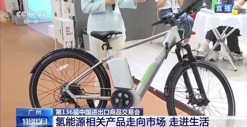 這款自行車,看起來和普通自行車沒什么區別,其實它是氫能自行車,由低壓便攜的氫氣瓶助力,讓爬坡、騎行更省力,它的速度最高可以達到20公里每小時。目前,國內一些城市的共享單車已運用上這樣的產品。我國的氫燃料汽車的研發也已經在路上,我們在廣交會現場也看到有的參展商展出了氫燃料電池發動機相關前沿產品。