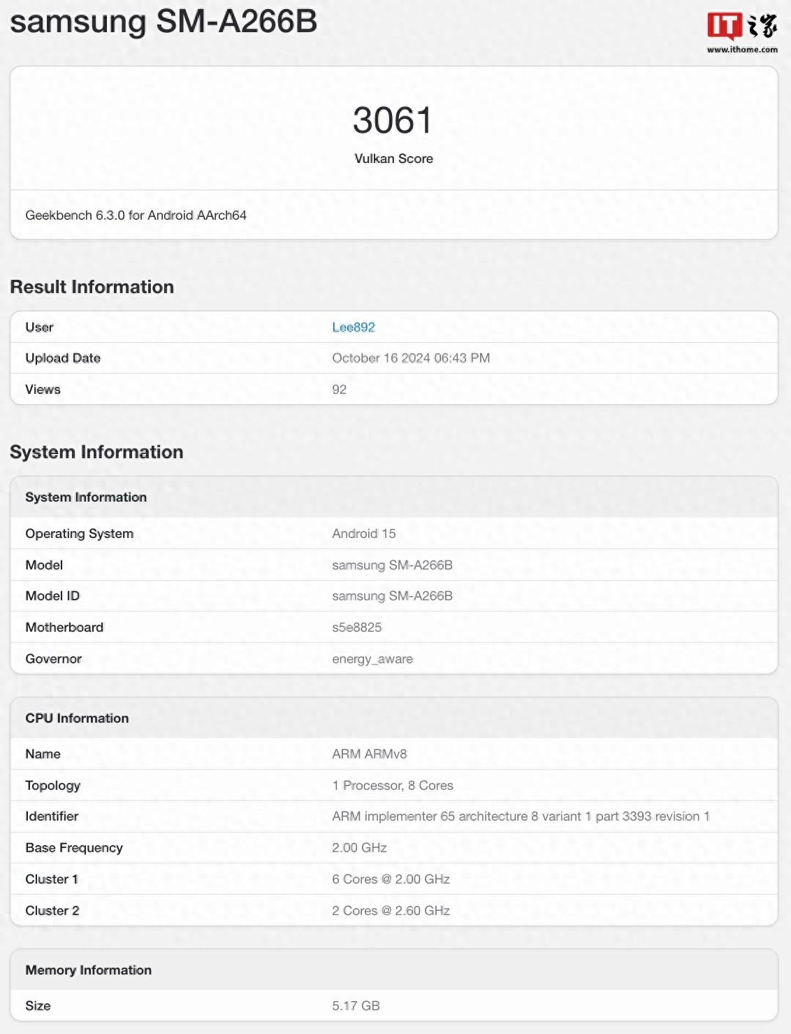 10 月 19 日消息,三星旗下 Galaxy A26 手機現(xiàn)已現(xiàn)身 Geekbench 跑分庫,IT之家注意到該機型號為 SM-A266B,依然搭載 Exynos 1280 處理器,內(nèi)置 6GB RAM,Vulkan 跑分為 3061 分。