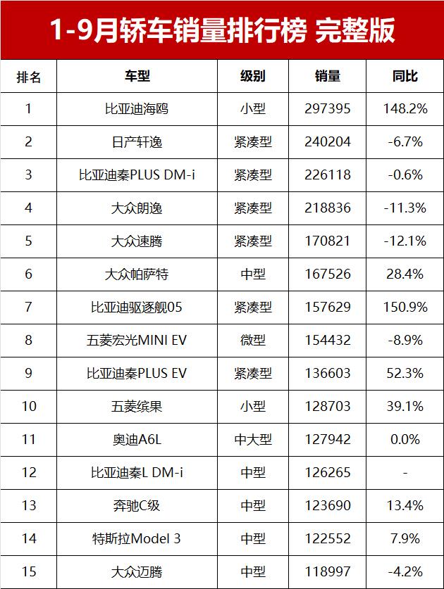具體來看,今年1-9月累計銷量超過10萬輛的轎車已經達到23款車型,其中4款車型銷量超過20萬輛。比亞迪海鷗銷量接近30萬輛,以297395輛的銷量奪得轎車銷量冠軍。