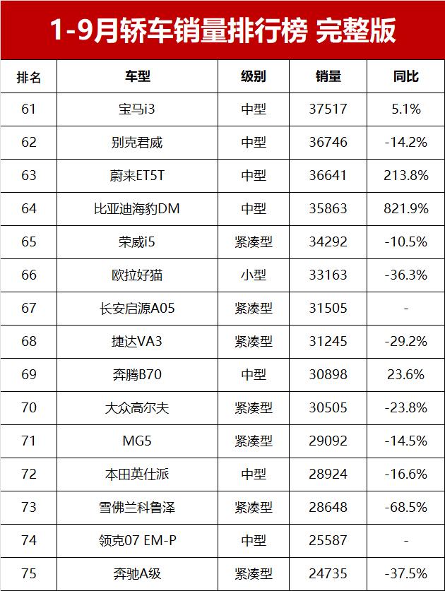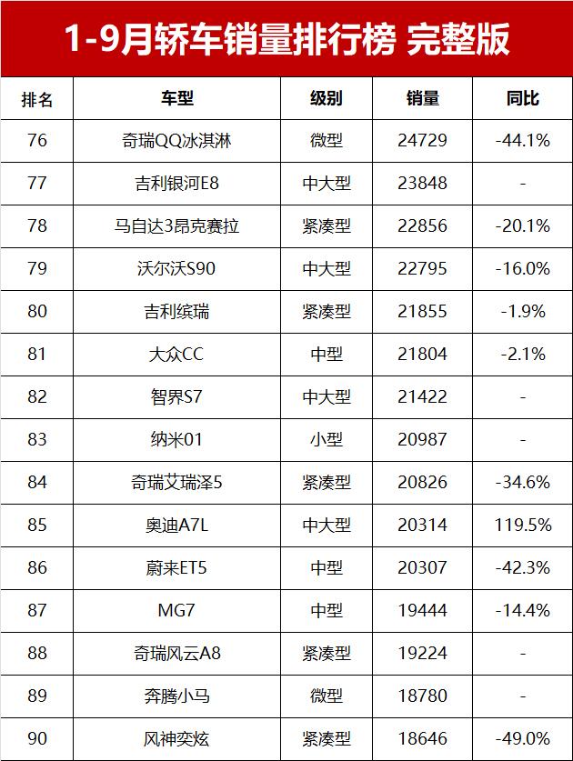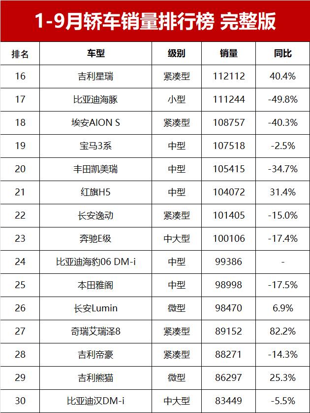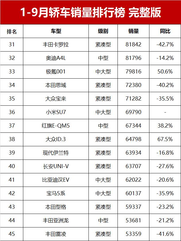 1-9月轎車銷量榜!1-234名,23款車超10萬輛,卡羅拉僅第31名