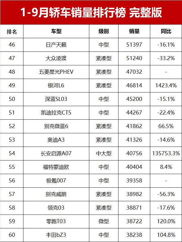 2024年1-9月轎車零售銷量排行榜】今年國內轎車市場銷量有所下滑,乘聯會數據顯示,2024年1-9月國內轎車市場零售銷量為718.9萬輛,同比小幅減少1.1%。1-9月轎車銷量榜出爐,1-234名,23款車超10萬輛,卡羅拉僅第31名!