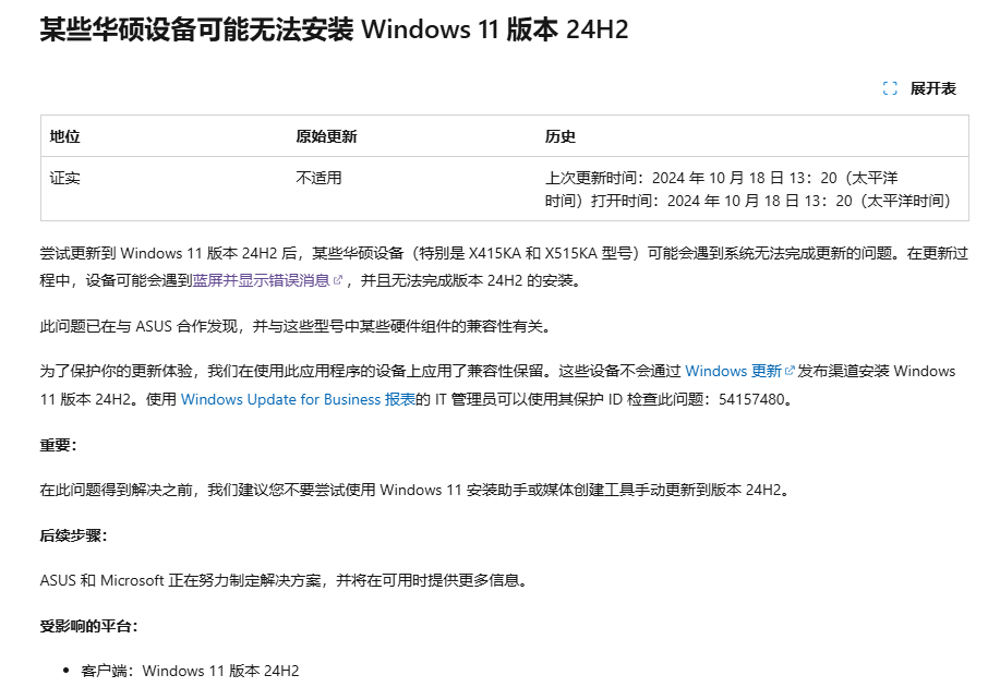 10月18日,微軟對這個問題進行了回應,確認包括X415KA和X515KA等機型在內的“某些華碩產品可能無法(成功)安裝Windows 11 24H2”,在安裝過程中可能會碰到藍屏,請參閱下圖。