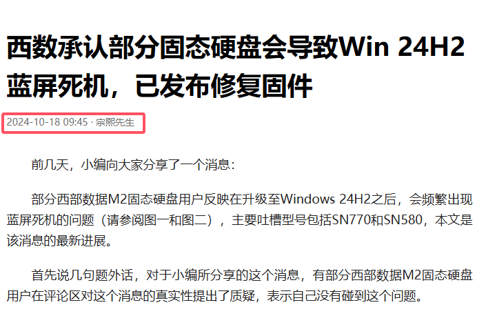 舉一個近期比較熱門的例子,西部數據的某些固態硬盤的固件存在與Windows 11 24H2不兼容的問,這類用戶升級安裝之后會頻繁出現藍屏死機題(請參閱上圖),微軟已經在安裝程序中加入了針對這幾款型號的檢測,以提醒這類用戶并阻止安裝。