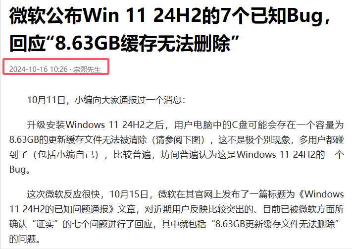 關于這方面的詳細情況,小編前些天寫過一篇標題為《微軟公布Win 11 24H2的7個已知Bug,回應“8.63GB緩存無法刪除”》的文章,詳細介紹了7種目前已知、比較嚴重的不兼容性問題。微軟會阻止這類用戶升級、安裝至Windows 11 24H2,感興趣的朋友可以在小編的主頁搜索閱讀,請參閱下圖。