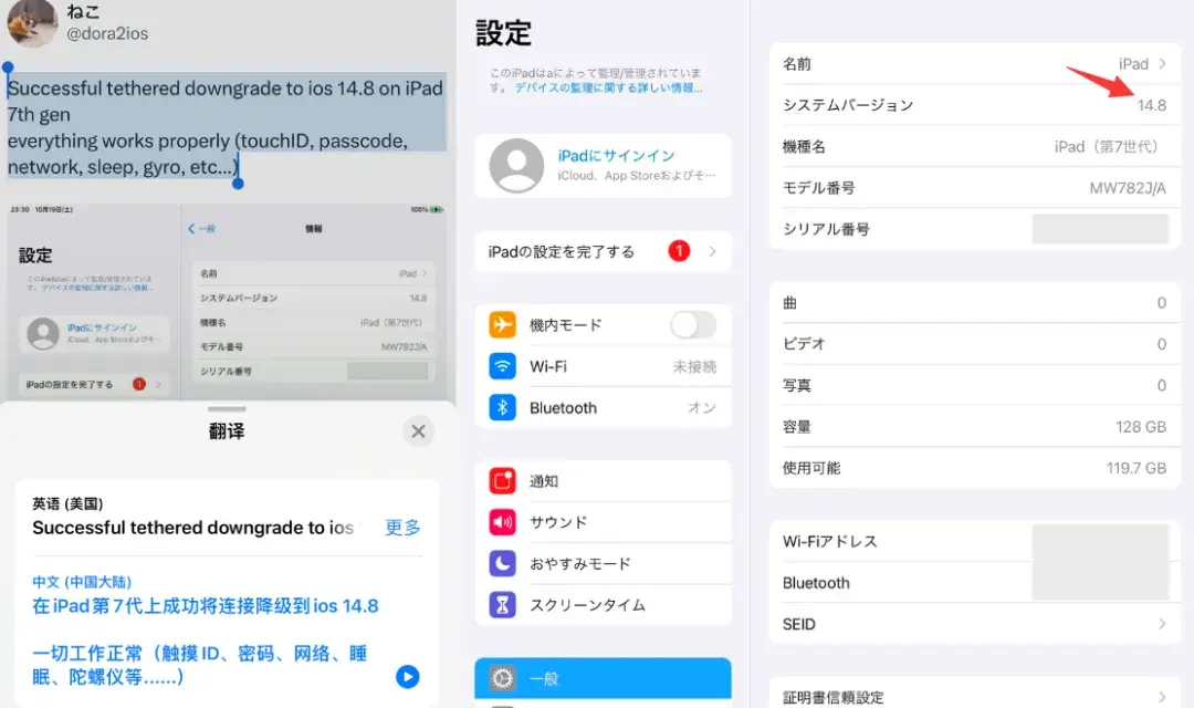 直到!10月20日上午時段,dora2ios 大神又帶來一條勁爆消息,告訴我們成功將 iPad 7 降級到 iOS 14.8 系統,降級成功后測試所有功能都正常,包括touchID、密碼、網絡和陀螺儀等。