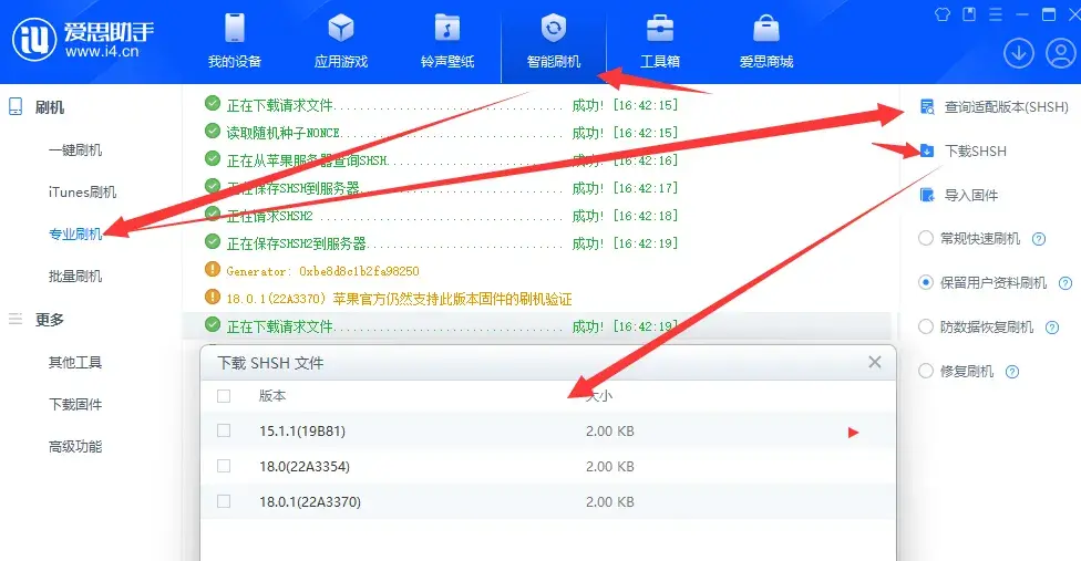 注意!此方法需要用到 SHSH(blob)才行,你之前沒有備份,則代表此方法不支持降級,你現在在愛思助手上,找到智能刷機-專業刷機-查詢SHSH-下載SHSH,這里就能看到,你本機備份SHSH有哪些系統。