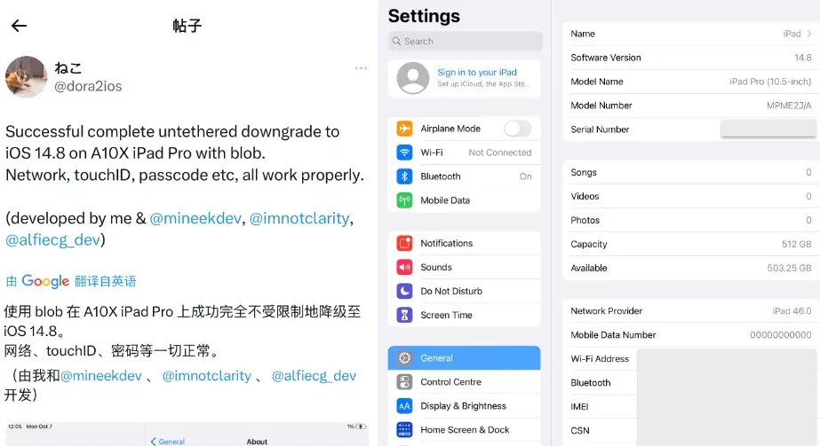 在10月8日上午時段,dora2ios 大神在 X 推特發文稱,使用 blob 在 A10X iPadPro 上成功實現降級到 iOS 14.8 系統,并且還提到網絡和touchID 和 密碼等正常,這是完美降級不受限制。