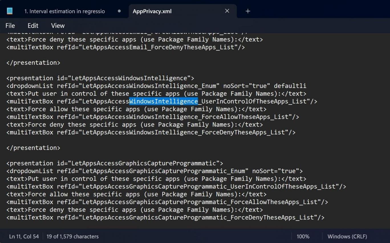 根據在“appprivacy.adml”中發現的引用,微軟正在探索對依賴 AI 的應用程序進行更嚴格的控制。該公司在這里使用了有趣的品牌名稱:“Windows Intelligence”。
