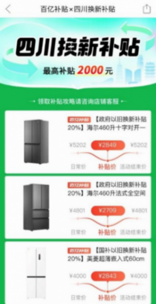 在平臺超額補貼的基礎上,百億補貼2600元消費券專區部分家電產品還將疊加國家補貼福利,價格再降15%。比如,長虹100英寸電視原價8999元,到手價7299元,以舊換新再打8折;美的635升對開門冰箱原價3299元,到手價2095元,以舊換新再打8折。