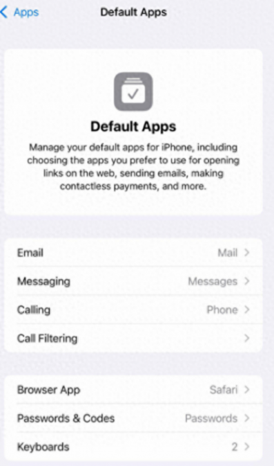 隨心所欲地選擇心儀的應用作為默認選項。這種前所未有的自由度,是不是聽起來就讓人心潮澎湃?沒錯,蘋果iOS 18.2的這次更新,正是將這一夢想變成了現實。具體來說,這次更新涵蓋了電子郵件、消息、電話、電話過濾、瀏覽器應用、密碼和代碼,以及鍵盤輸入法應用等多個方面。