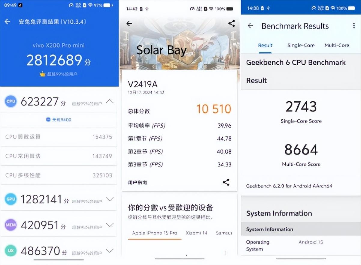 接下來看看跑分,vivo X200 Pro mini跑安兔兔V10版本成績為2812689,相較天璣9300芯片有明顯提升。GeekBench 6測試獲得單核2743,多核8664分的成績。在考驗光線追蹤性能的3DMark SolarBay測試中,vivo X200 Pro mini獲得10510分,關于光追在游戲中的實際顯示效果我們也進行了測試。