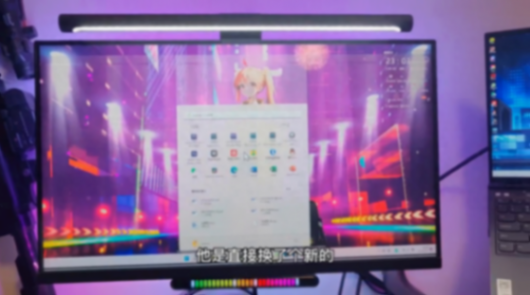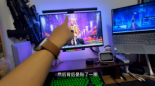 下面是貼了一個RGB的氛圍燈,背后是貼了一圈也是RGB的氛圍燈。這是米家的屏幕掛燈,但是我感覺很少用,因為我每次一開燈之后,桌面會有反光,桌面這里會有反光。我感覺它雖然屏幕沒有反光,但是這里是有反光的。有時候打字鍵盤字有點看不清楚,所以我一般就很少開這個燈。