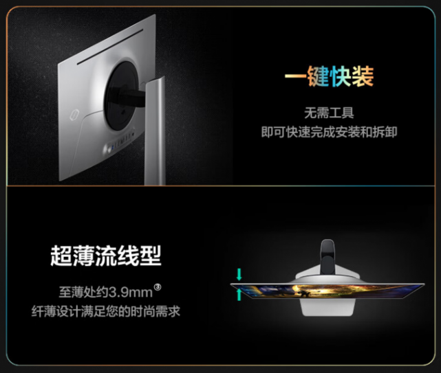 另外因為OLED面板可以做的很薄,所以三星玄龍騎士G61SD的至薄處只有3.9mm,再加上流線型的機(jī)身設(shè)計,顏值非常高。同時顯示器支架支持一鍵快裝,不需要工具,徒手就能夠完成安裝和拆卸。