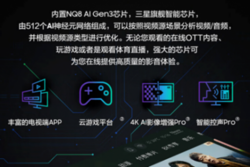 此外它還內(nèi)置了三星NQ8 AI Gen3旗艦智能芯片,并且搭載AI驅(qū)動的智能娛樂系統(tǒng)。NQ8 AI Gen3芯片由512個AI神經(jīng)元網(wǎng)絡(luò)構(gòu)成,可以實時根據(jù)源場景對音視頻進(jìn)行分析、優(yōu)化,提供更出色的體驗。搭載的娛樂系統(tǒng)也有著豐富的電視端APP,并且支持云游戲。這意味著它可以獨(dú)立于PC使用,就像一臺OLED電視一樣。