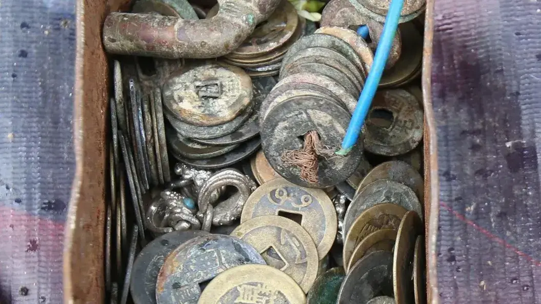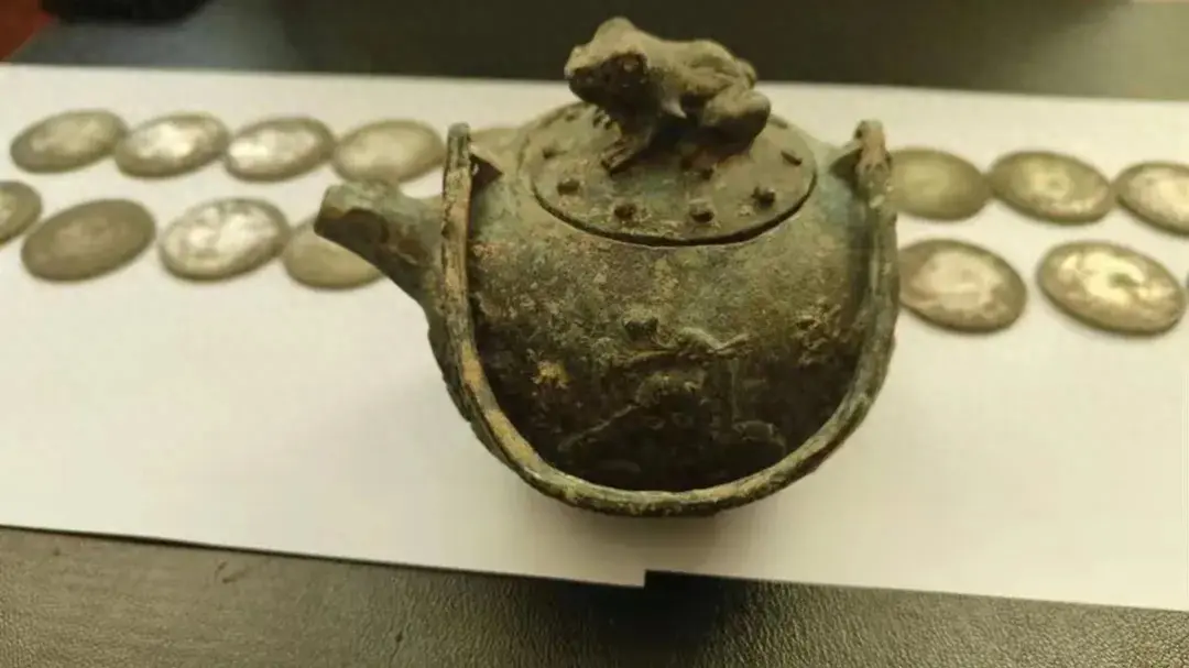 那把青銅提梁壺,壺底“大清御制”的字樣,仿若一位穿越時光而來的老者,輕聲訴說著往昔的輝煌與榮耀。那蒼勁有力的字體,似在向世人展示著曾經的皇家風范。壺內的光緒元寶和民國三年袁世凱頭像銀幣,猶如沉默的歷史見證者,靜靜地躺在那里,默默記錄著歲月的滄桑變遷。它們身上的每一道紋路、每一處銹跡,都似在講述著一個古老而動人的故事。
