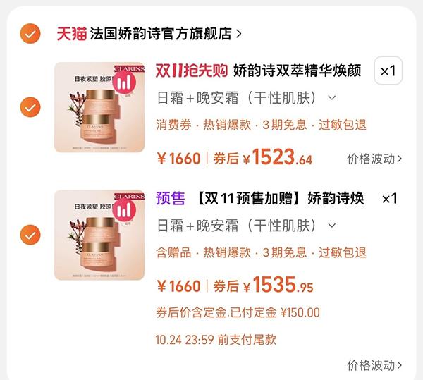 “比如貓糧,定金是70元,疊加了店鋪優(yōu)惠、跨店滿減、紅包后,最終實(shí)付款是321.41元。但22日同一個鏈接同一個商品,直接購買的價格是308.31元。護(hù)膚品也是一樣,預(yù)售券后實(shí)付款是1535.95元,直接購買的價格是1523.64元。”小林仔細(xì)對比了自己購物車?yán)锏亩鄠€已支付定金的預(yù)售產(chǎn)品,均發(fā)現(xiàn)預(yù)售價格反而更貴。