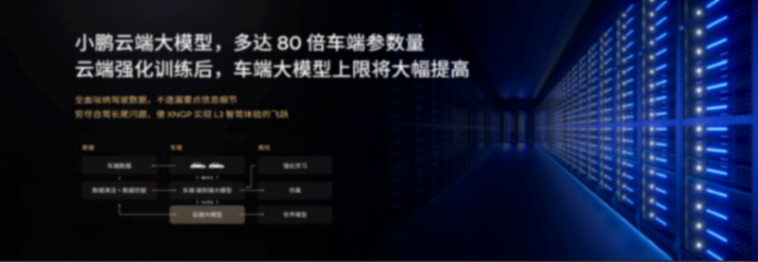 怎么樣理解云端大模型的應用呢?根據小鵬給出的示意圖,基本可以理解為云端大模型做出來以后會“知識蒸餾”成車端的端到端模型,再上車應用。這樣的優勢在于因為云端大模型足夠大,信息量足夠豐富——小鵬云端大模型的參數量將多達車端參數量80倍,如此大的參數量意味著云端大模型能夠全面吸納智駕數據,不遺漏重點信息細節——這樣“蒸餾”出來的車端大模型上限也就更高。之后車輛的駕駛數據、離線強化學習也可以反饋給云端模型,不斷優化。