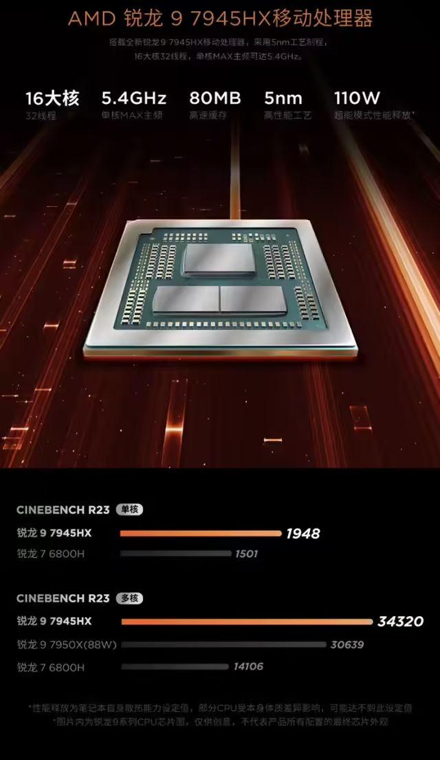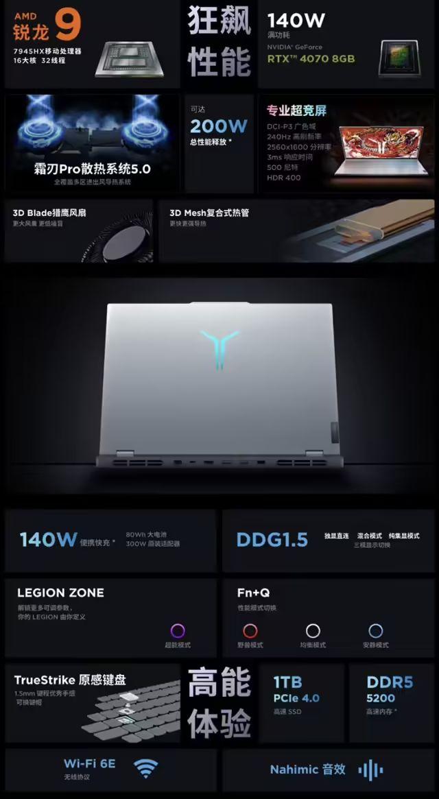 該機(jī)搭載 16 核心 32 線程 AMD 銳龍 9 7945HX 處理器,配備 16GB DDR5 5200MHz RAM 及 1TB PCle 4.0 固態(tài)硬盤(pán),使用 140W RTX4070 顯卡,采用了霜刃 Pro 散熱系統(tǒng) 5.0,整機(jī)性能釋放可達(dá) 200W(IT之家注:CPU 及 GPU 分別可達(dá)為 100W、140W),支持獨(dú)顯直連。