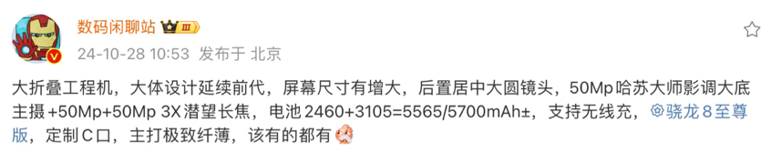 根據博主@數碼閑聊站 最新爆料顯示,OPPO大折疊工程機有了更多確認的消息,外觀設計大體延續前代風格,屏幕尺寸增大,后置居中大圓環相機模組,內置5000萬像素哈蘇大師影調大底主攝、5000萬像素超廣角鏡頭、5000萬像素3X潛望長焦鏡頭,內置5700mAh大電池,支持無線充,核心搭載驍龍8至尊版,定制Type-C接口,主打輕薄體驗。