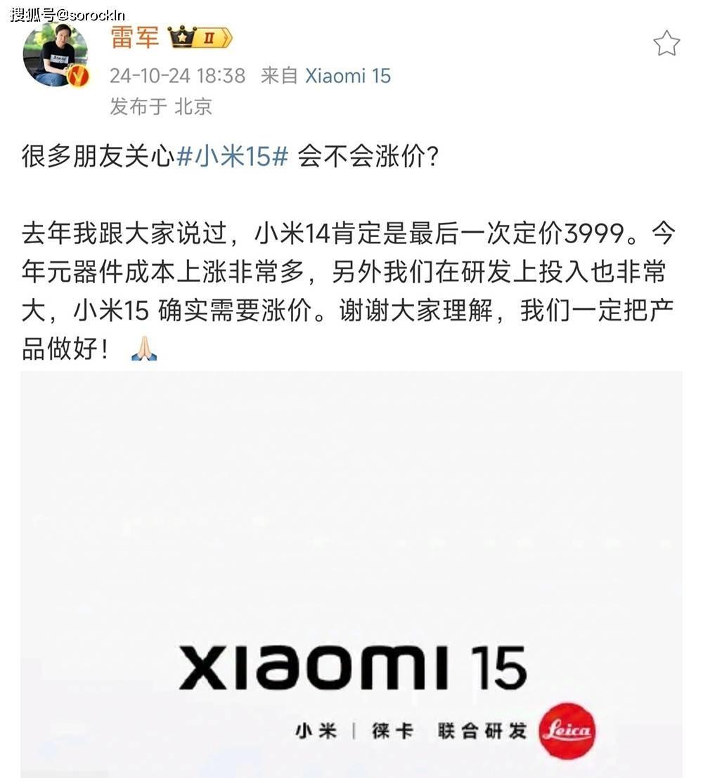 小米15系列定價策略備受關注,雷軍曾公開表示,受供應鏈成本上漲等因素影響,小米15系列價格將會進行上調,考慮到小米一貫“性價比”策略,相信小米15系列最終定價依然會保持一個合理范圍內