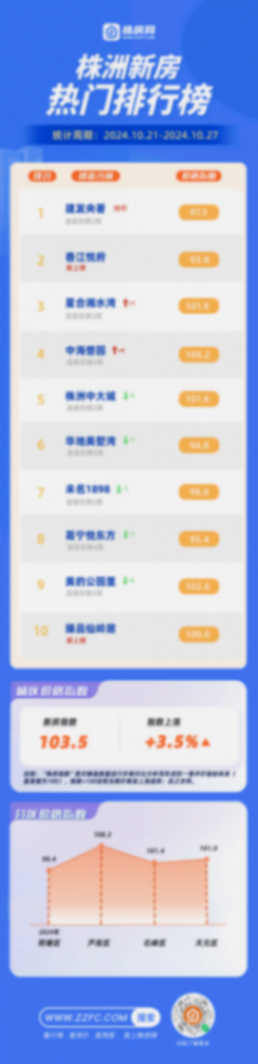 株洲市中心城區上周(10.21-10.27)新建商品住房熱門排行榜前十分別為建發央著、香江悅府、星合湘水灣、中海譽園、株洲中大城、華地美墅灣、未名1898、葛寧悅東方、美的公園里、臻品仙嶺居。