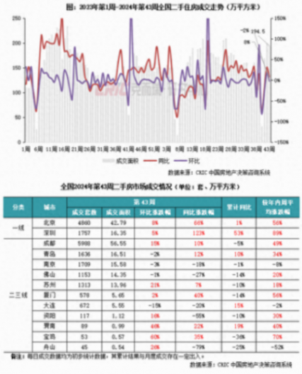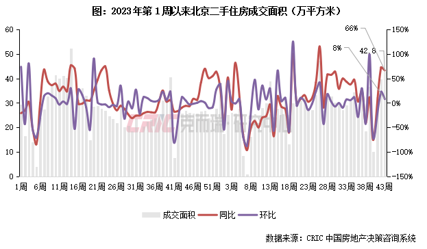 2024年第43周,北京二手房成交面積42.79萬平方米,環比增長8%,同比增長66%,較周平均增長56%。