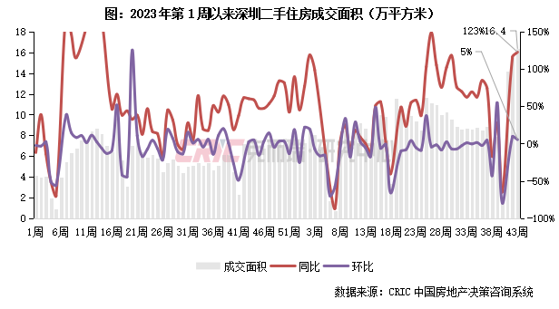 2024年第43周,深圳二手房成交面積16.35萬平方米,環比增長5%,同比增長123%,較周平均增長89%。
