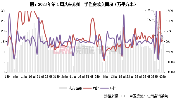2024年第43周,蘇州二手住房成交面積13.96萬平方米,環比增長21%,同比增長7%,較周平均增長18%。