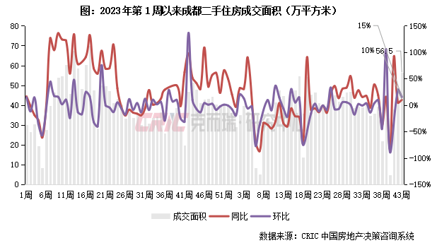2024年第43周,成都二手住房成交面積56.55萬平方米,環比增長15%,同比增長10%,較周均值增長49%。