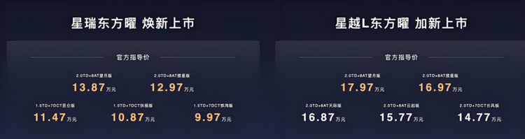 10月27日,吉利中國星東方曜系列車型在汽車市場掀起波瀾,盛大上市。該系列車型包括星瑞東方曜和星越L東方曜,其中星瑞東方曜推出1.5TD+7DCT和2.0TD+8AT共五個版型,官方指導價為9.97萬-13.87萬元;星越L在現有車型上加新推出兩款東方曜版型,官方指導價為14.77萬-17.97萬元。