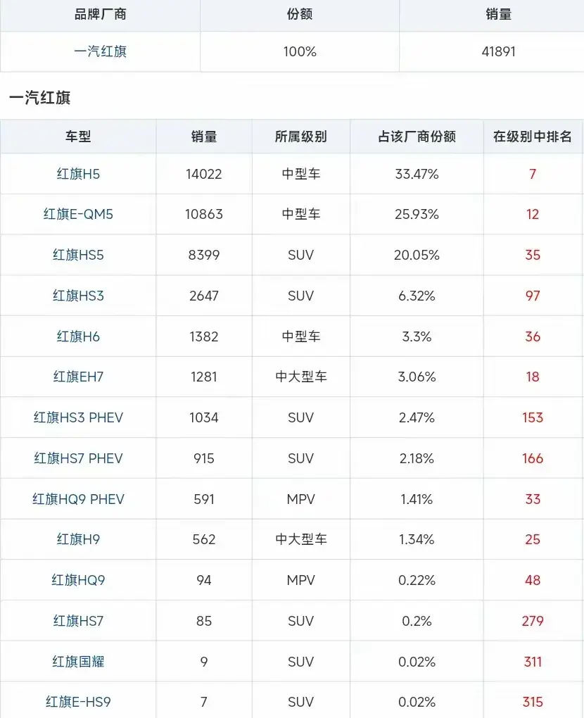紅旗HS5、HS7 PHEV、HQ9 PHEV、H9這些車型,表現(xiàn)也還行,銷量在600多輛。不過,紅旗E-HS9的表現(xiàn)就有點差強人意了,銷量排名靠后。希望后面能加把勁,把銷量搞上去。