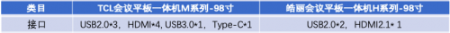 TCL會議平板一體機提提供接口包括HDMI*4、USB2.0*3+USB3.0*1和Type-C*1 ,皓麗會議平板一體機提供接口則包括HDMI2.1*1、USB2.0 *2。