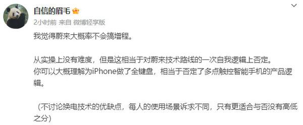 他稱:我覺得蔚來大概率不會(huì)搞增程。從實(shí)操上沒有難度,但是這相當(dāng)于對(duì)蔚來技術(shù)路線的一次自我邏輯上否定。你可以大概理解為iPhone做了全鍵盤,相當(dāng)于否定了多點(diǎn)觸控智能手機(jī)的產(chǎn)品邏輯。沈義人表示:不討論換電技術(shù)的優(yōu)缺點(diǎn),每人的使用場(chǎng)景訴求不同,只有更適合與否沒有高低之分。
