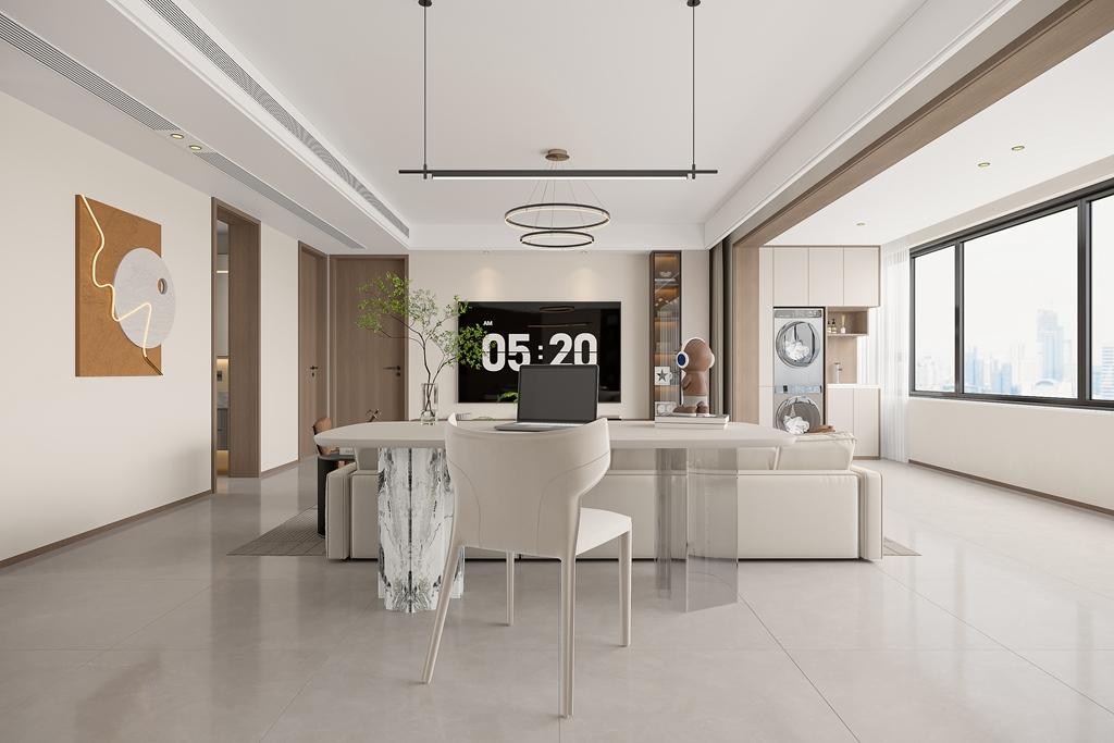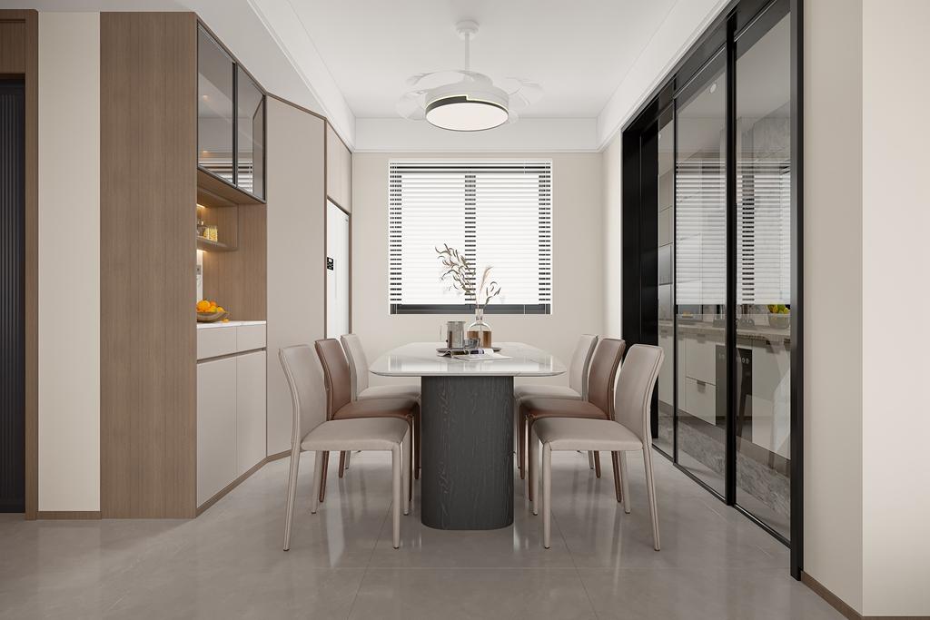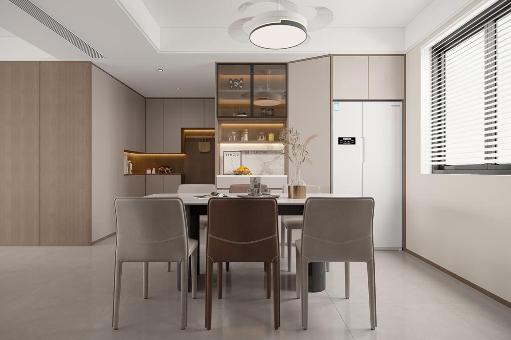 獨立的用餐空間,與入戶形成一個統一,餐廳生活動線非常便捷。精選的時尚餐桌椅,搭配一體化的定制柜,在簡約溫馨的吊燈的映襯下,更顯精致、溫馨,儀式感拉滿。