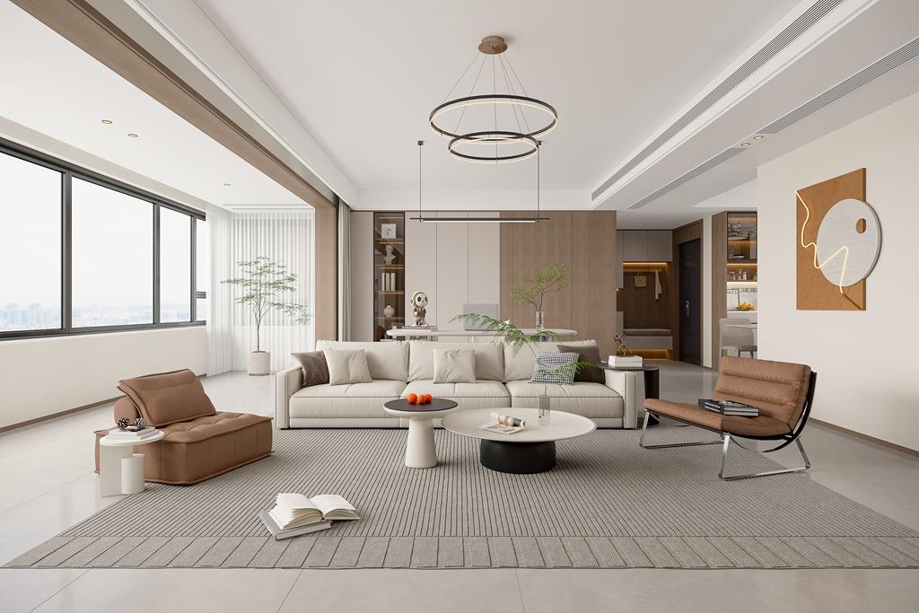 原始大橫廳的結構,寬敞通透,極大的引入了自然光線,也將室外的景觀最大程度的保留下來,視野非常開闊。整個客廳以白色和原木色鋪開,搭配米白色的沙發、圓形茶幾以及淺灰色的地毯,圍合出一個溫柔、細膩且溫馨的休息空間。