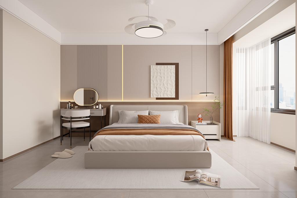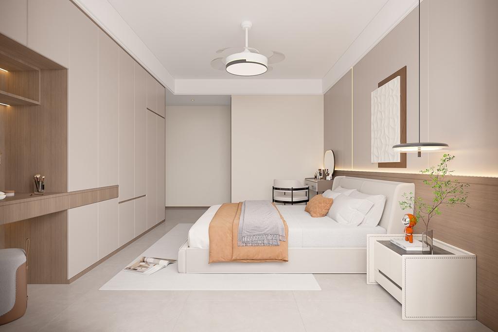 主臥室繼續延續整體簡約、自然的格調,以白色和原木色為基調,讓空間看起來更加柔和。半墻床頭與柜體的原木相呼應,氛圍點綴的床頭燈設計,回歸臥室原本的寧靜與舒適感。