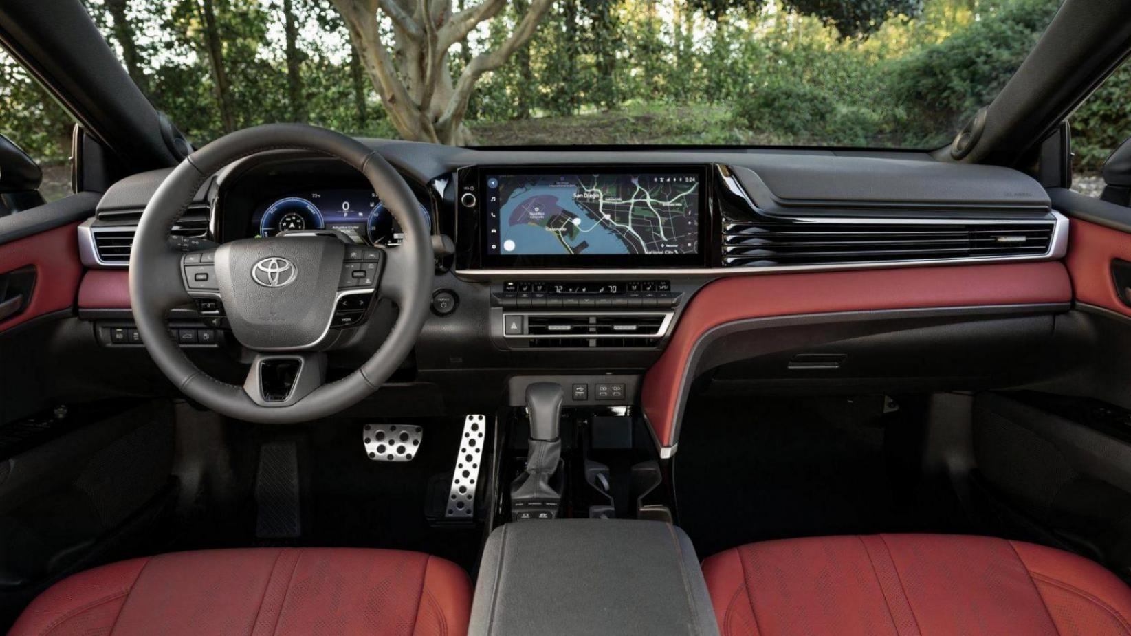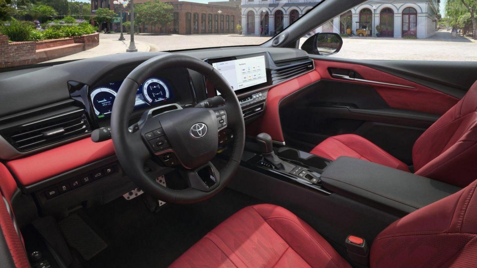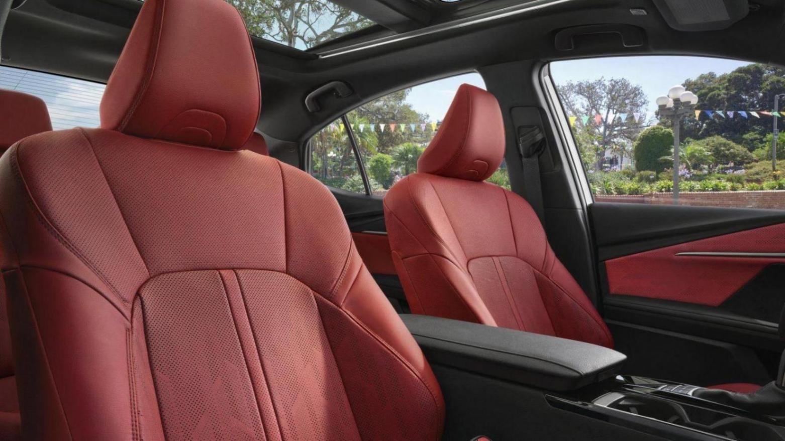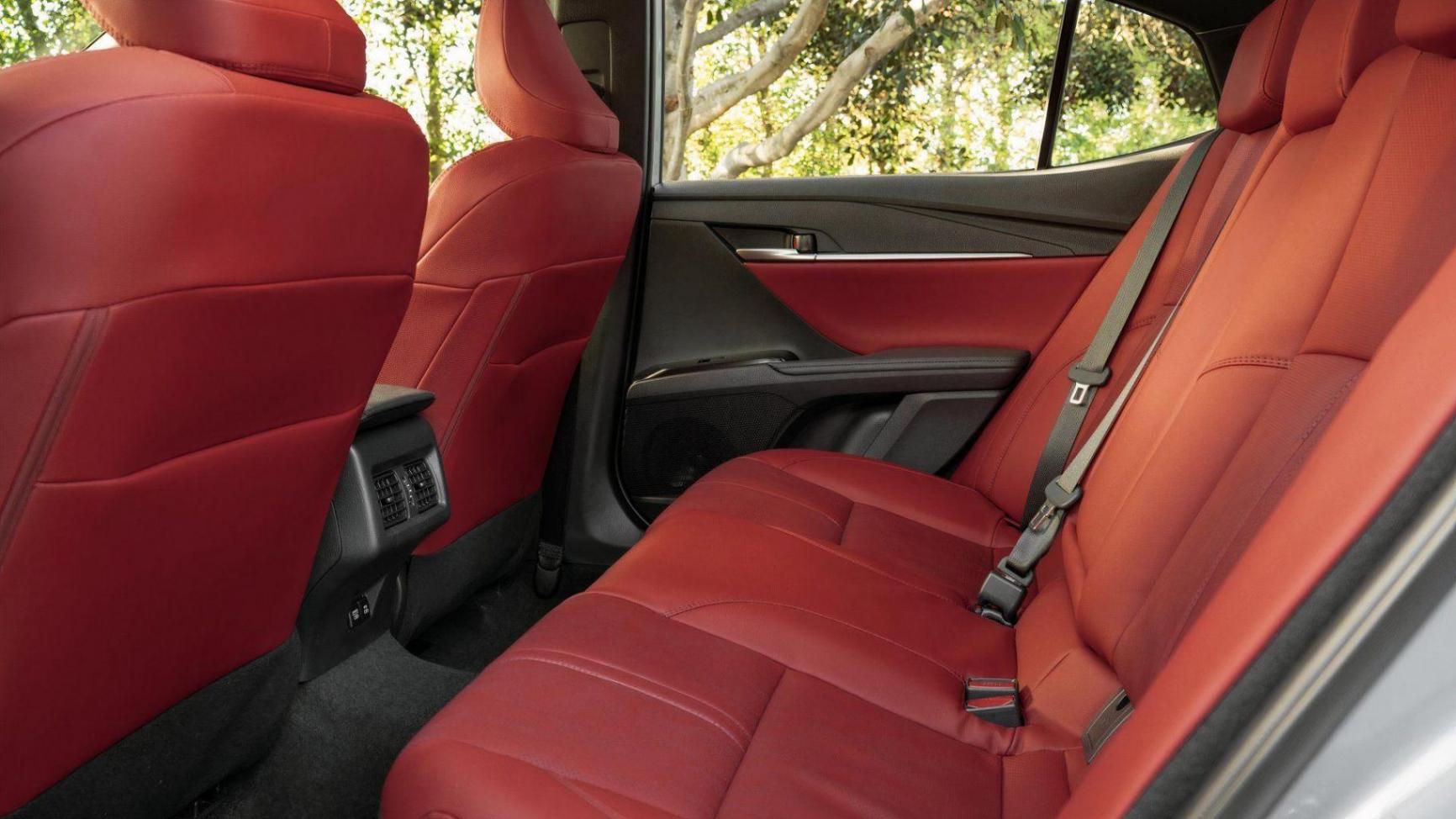 紅色的豐田凱美瑞內飾是新車型的一大亮點,與黑色形成鮮明對比,配有皮革包裹的前排座椅,支持加熱和通風功能。