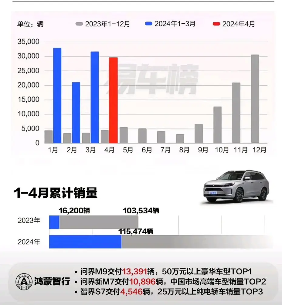 其次排第二梯隊的為:鴻蒙智行(包含問界及智界)與理想,分別銷量破2萬5大關,本月問界及理想都有小幅度下滑。