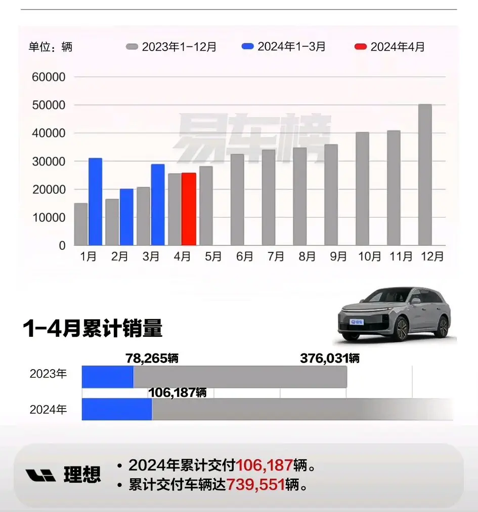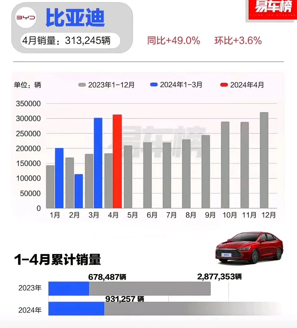 排在銷量榜第一梯隊的為比亞迪,4月銷量為313,245 輛,相對比3月份302,459有很大提高,多賣了1萬多輛。同比更是增加了49.0%。4個月累計突破了93萬,離目標400萬還有不小距離,若想達到目標,剩余每月至少達到38萬輛才能完成大的400萬目標。