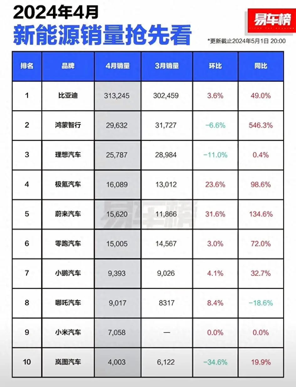 第三梯隊銷量榜為:極氪汽車16,089輛同比增長 98.6%` 蔚來汽車 15,620 輛%同比增長134.6%、零跑汽車 15,005輛 14,567輛、同比增長72.0%。小鵬汽車 9,393 輛同比增漲 32.7%、哪吒汽車 9,017輛同比下跌 -18.6%、小米汽車 7,058 輛、嵐圖汽車 4,003輛同比增漲19.9%