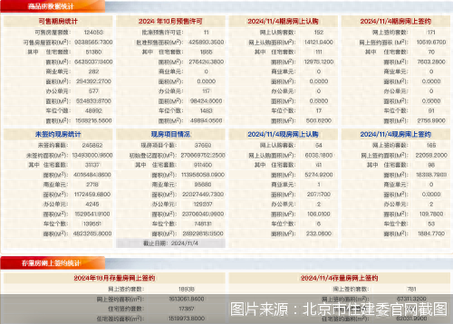 北京市住建委官網數據顯示,11月4日北京新房網簽336套,網簽面積32577.87平方米,其中住宅網簽168套,網簽面積25912.07平方米;二手房網簽781套,網簽面積67311.32平方米,其中住宅網簽697套,網簽面積62031.99平方米。