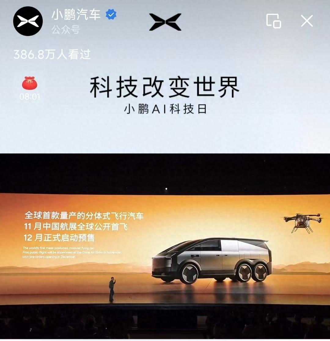 11月6日,在小鵬AI科技日活動上,小鵬汽車董事長、首席執行官何小鵬宣布小鵬匯天推出的全球首款量產的分體式飛行汽車,將于11月在廣東珠海舉辦的第十五屆中國國際航空航天博覽會上全球公開首飛,12月正式啟動預售。