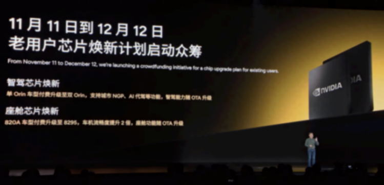 11月6日下午,在小鵬AI科技日上,小鵬汽車董事長何小鵬宣布,老用戶芯片煥新計劃將于11月11日至12月12日啟動眾籌。根據計劃,老用戶可付費升級車機芯片,單Orin車型可升級至雙Orin芯片,820A車型可升級至8295芯片。